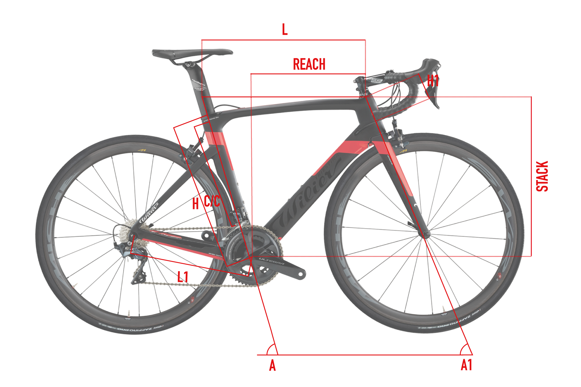 SIZE | H | C/C | L | A | H1 | L1 | A1 | REACH | STACK | WHEELBASE |