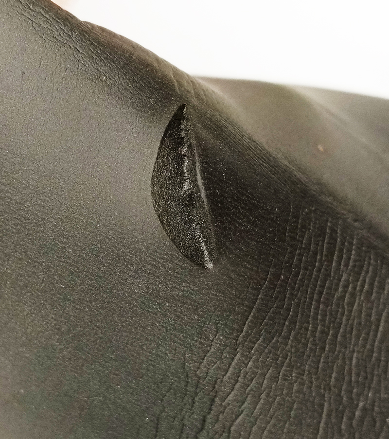 Гидрокостюм имеет дефект. Несквозной надрез. Самый низ ноги.