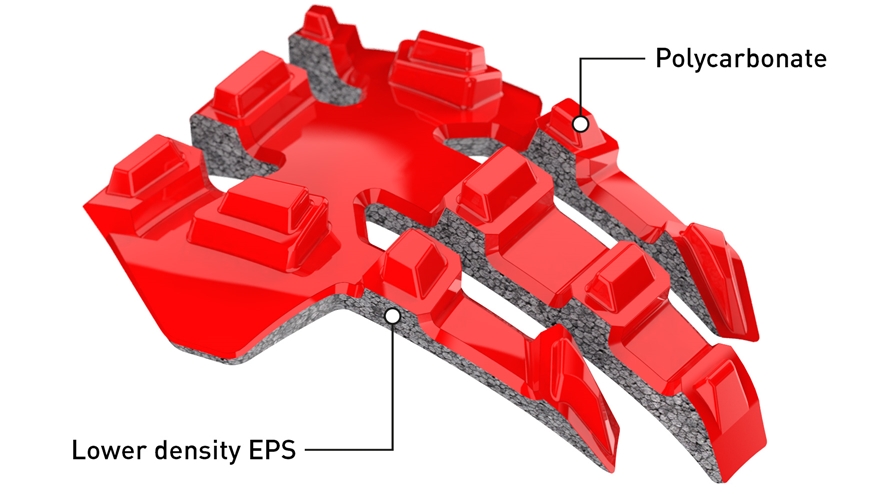 С другой стороны, его структура характеризуется более мягкой плотностью, чем внутренняя оболочка, что обеспечивает отличную амортизацию и снижает вес шлема.