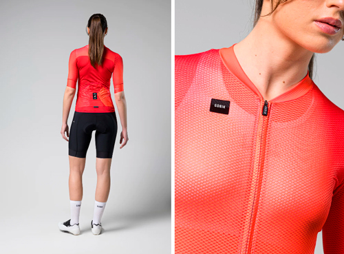Используется уникальное сочетание тканей, сшитых вручную, что снижает аэродинамическое сопротивление спереди и на рукавах благодаря текстурированной отделке и в то же время способствует циркуляции воздуха сзади благодаря гладкой микроперфорированной отделке.