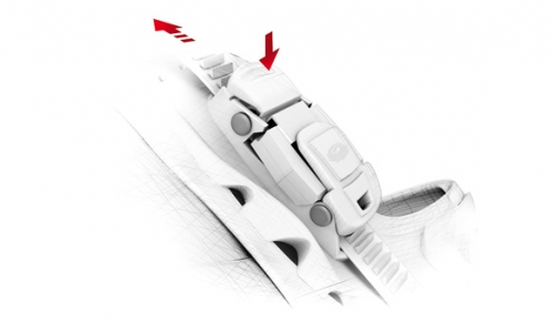 Встроенный замок на липучке из полимерных зубьев. При фиксации ремня зубцы зацепляются за ответную часть и предотвращают смещение, делая соединение надёжным и более жёстким, что обеспечивает идеальную посадку по ноге спортсмена.